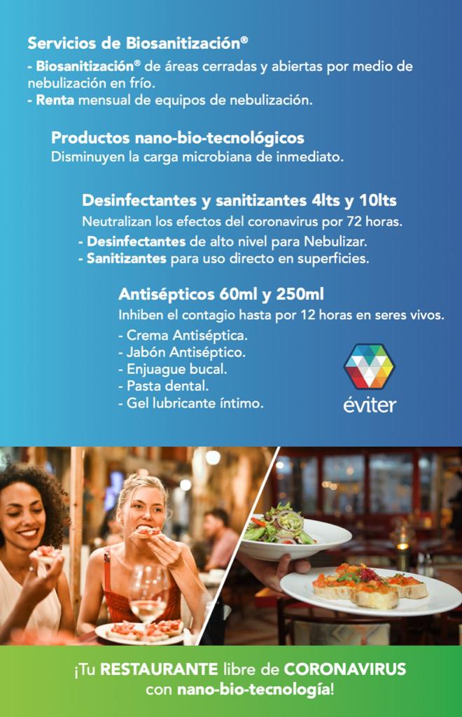 BIO SOLUTEM le ofrece su servicio de Biosanitización, ¡Mantén tus clientes fuera del alcance del COVID-19, ¡Protege a tus comensales hasta por 12 Horas! Obtén el certificado de #EspacioBioseguro Avalado por COFEPRIS.