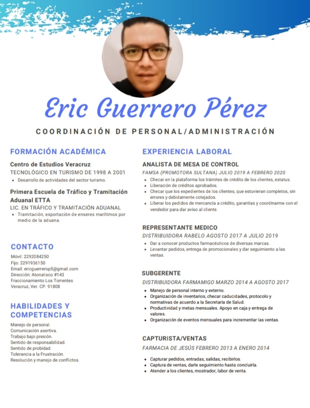 Bolsa de Trabajo Erick Guerrero Pérez Coordinación de Personal / Administración Soy una persona responsable con una buena comunicación asertiva manejo de personal, aporto en resolución y manejo de conflictos… Previous Post (p) Bolsa de Trabajo Next Post (n) Café en corto