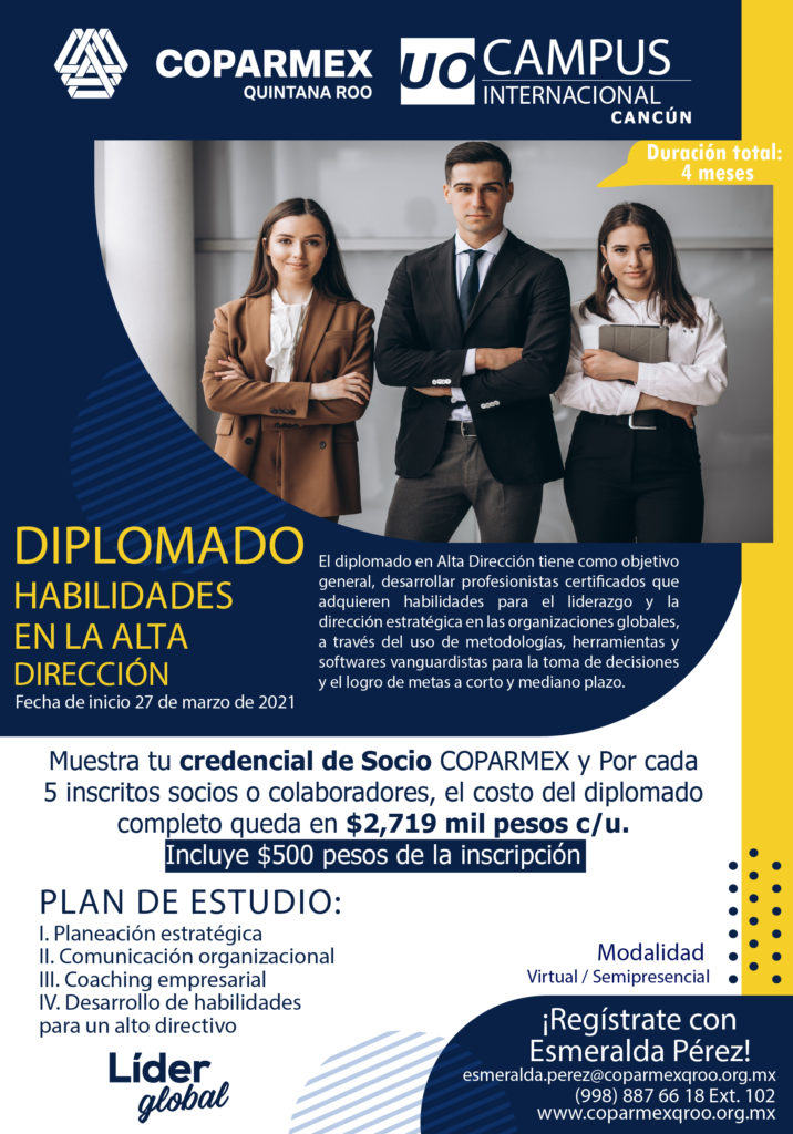La Universidad de Oriente Cancún en conjunto con COPARMEX Quintana Roo, le invitamos a inscribirse al “Diplomado Habilidades en la Alta Dirección”, Fecha de apertura: 27 de marzo de 2021 Duración: 120 horas | 4 módulos Horario: 13:00 a 19:00.